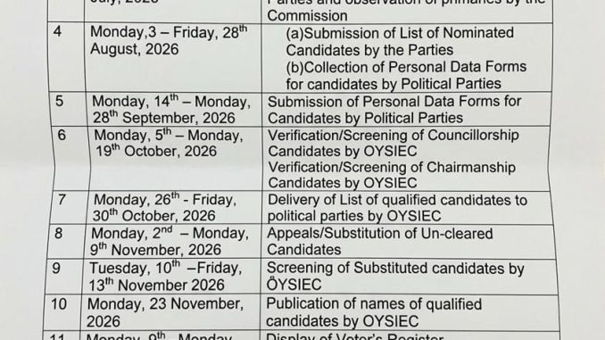 The Oyo State Independent Electoral Commission (OYSIEC) has announced Tuesday, 29 December 2026 as the new date for the conduct of the local government council elections across the state. This is contained in a statement […]